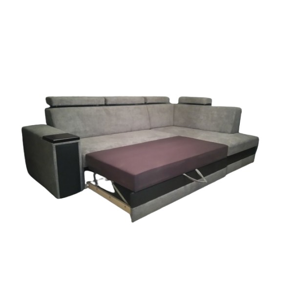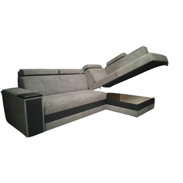 Nowoczesny, funkcjonalny narożnik z zagłówkami, na sprężynach, z funkcją spania. Wysokość podnoszenia zagłówków można regulować według potrzeb.