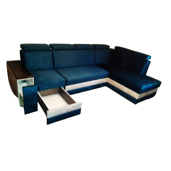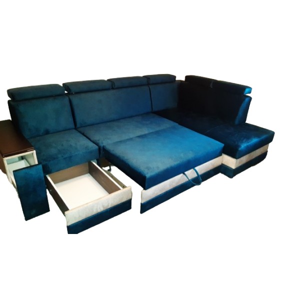 Nowoczesny, funkcjonalny narożnik z zagłówkami, na sprężynach, z funkcją spania. Wysokość podnoszenia zagłówków można regulować według potrzeb.